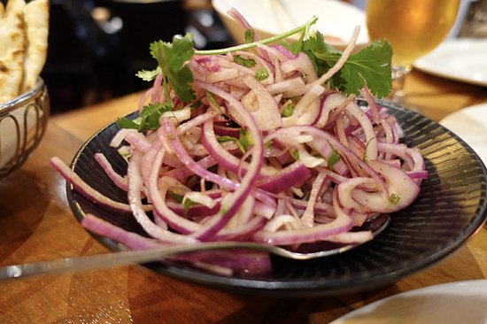 Freshly chopped onions mixed through with spicy mint chutney and chopped green chillies.