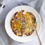 Manjit’s adds a unique spin to the traditional vegetable samosa: a lightly crushed samosa topped with sweet plain yogurt, mint chutney, tamarind sauce, and finished with a sprinkle of chopped onions.