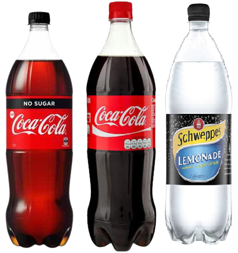 Coke, Coke NO Sugar, and Lemonade Bottles.